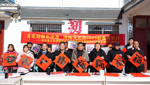 新春到,为迎接新年的到来,让广大人民群众过上一个欢乐喜庆的春节。2025年1月,省文联党组举行开展“百花迎新乐中原——河南文艺界新春欢乐行”活动。1月15日,淮滨县文联、淮滨县书法家协会、淮滨县摄影家协会到赵集镇学礼村为群众义写春联、送春联,拍摄全家福活动,以此活跃群众的节日文化氛围。